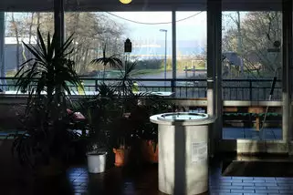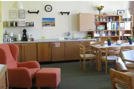 Im Eingangsbereich liegt der Speisesaal mit der Küche, das Lehrerzimmer und das Büro der Heimleitung. Das Lehrerzimmer ist für alle begleitenden Lehrkräfte Treffpunkt und Kommunikationsraum. Hier wird Organisatorisches mit der Heimleitung geklärt, im Internet recherchiert, miteinander geklönt oder gemütlich in der Zeitung geschmökert.