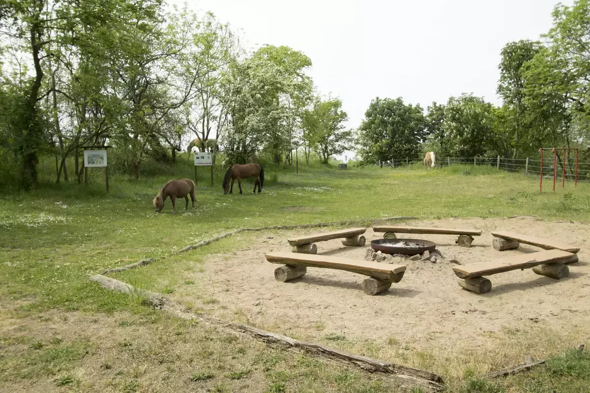 Der Zeltplatz befindet sich im hinteren Teil des Geländes direkt neben der Pferdekoppel. Dort kann an der Feuerstelle gemütlich gekocht (Dreibein und dazugehörige Topf vorhanden) und die Natur entdeckt werden. Auf Anfrage kann zum Zeltplatz der Ökokiosk, eine kleine Holzhütte mit zwei Räumen inkl. Küche (Kühlschrank, Kochplatte, Mikrowelle, Geschirr, Spülmaschine, Wasserkocher, Kaffeemaschine, Tische, Stühle), sowie die angrenzende überdachte Terrasse mit Tischen und Stühlen dazu gemietet werden.