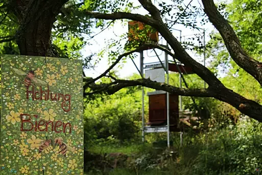 Das Gästehaus ist idyllisch in ein Wäldchen eingebettet und liebevoll mit Naturmalereien verziert .