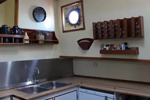 In der komplett eingerichteten Küche befinden sich Kühlschrank (ein zweiter Kühlschrank ist im Salon), Tiefkühler, ein großer Backofen, ein vierflammiger Gastrogasherd und Zubehör (z.B. Rührgerät). An Bord stehen 3 Duschen und 3 Toiletten zur Verfügung.