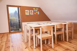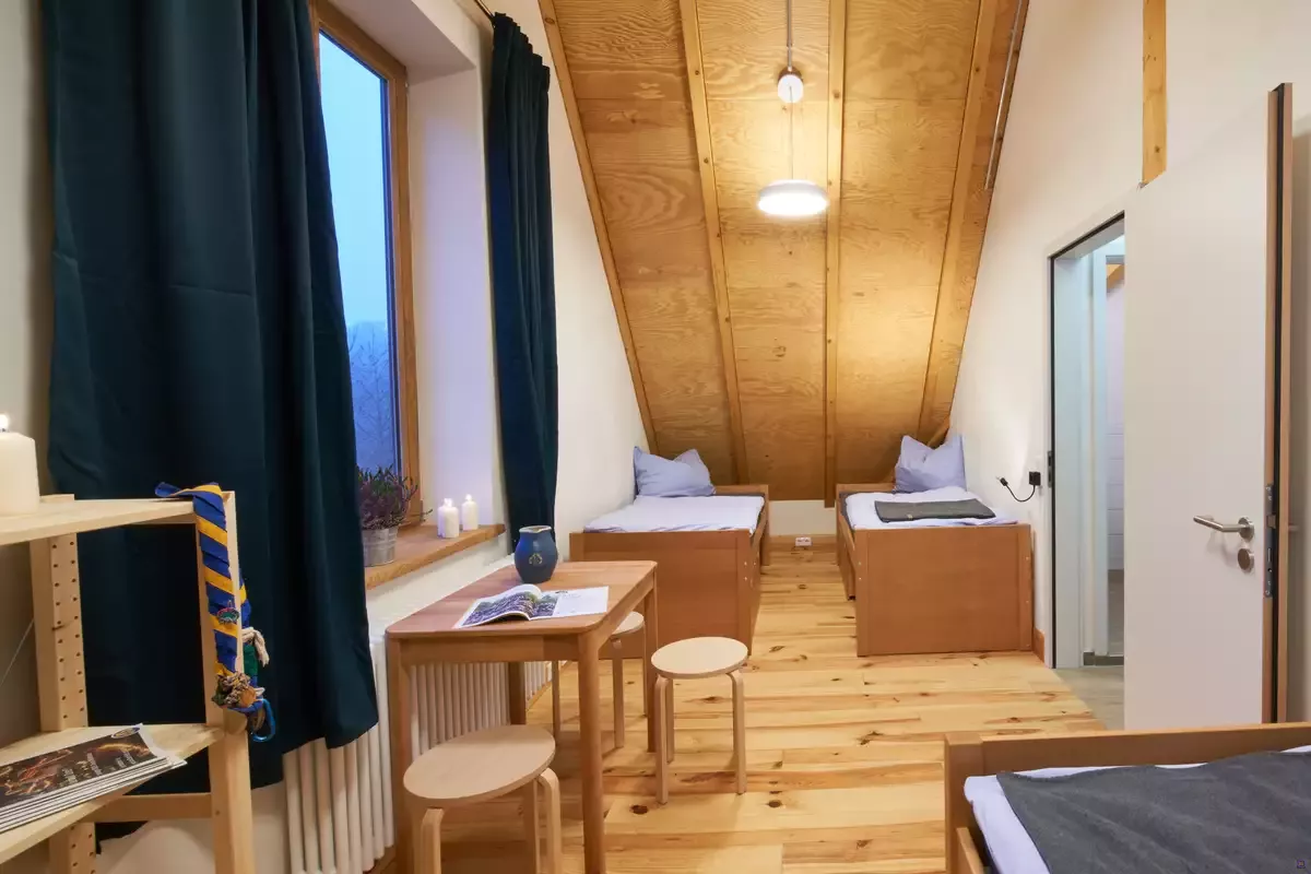 Jedes unserer vier Gruppenhäuser bietet acht Betten in einem großen Spitzboden sowie ein kleiners Zimmer im Erdgeschoss mit 3-4 Betten. Außerdem verfügen die Unterkünfte über einen Aufenthaltsraum mit Kamin, eine Küche zur Selbstverpflegung sowie Dusche/WC und Heizung. Das zentrale Fachwerkhaus zwischen Küchenhaus und Bürogebäude des BdP Bundesamt beherbergt den großen Saal und die Seminarräume. Die Ferienwohnung bietet Ihnen drei Schlafräume für insgesamt fünf Personen, eine moderne Küchenzeile, ein Bad mit WC und Dusche sowie ein Wohnzimmer mit großem Sofa und Fernseher.