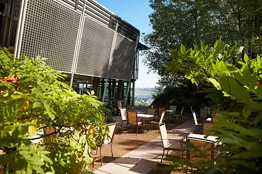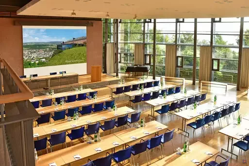 Die Aula des Robert-Schuman-Haus mit dem Stein- und Holzfoyer sowie dem angrenzenden Terrassenbereich ist eine einzigartige Location für jegliche Art von Veranstaltungen. Dieser Bereich wurde 1997 an den bisher bestehenden Teil des Hauses von 1931 erweitert.