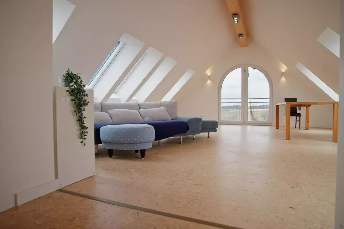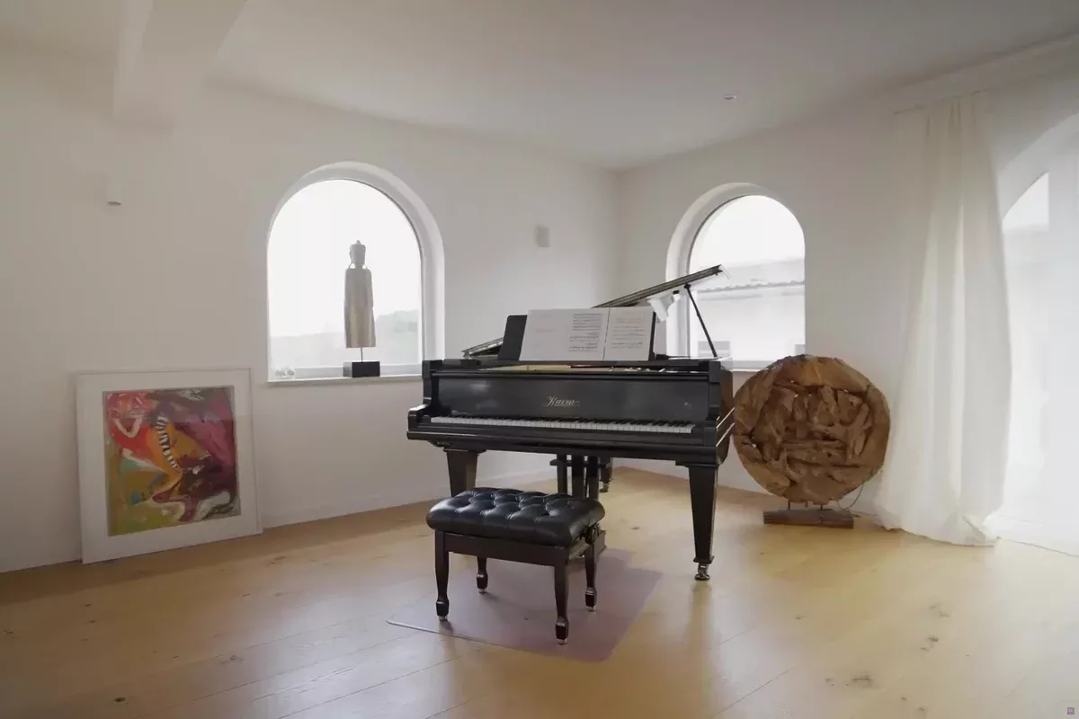Das sehr große Wohnzimmer (ca. 60 qm) bietet gemütlichen Aufenthalt. Es ist von seiner großzügigen Fläche ideal für Yoga. Auch für musikalische Gäste gibt es es ein Klavier.
