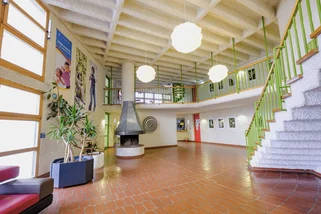 Kamin in der Halle, Speisesaal, eigene Kletterhalle mit Boulderwand und Niedrigseilelementen auf dem Gelände. großes Außengelände, Märchenhöhle, Spielplatz. Klavier, E-Piano und eine Gitarre.