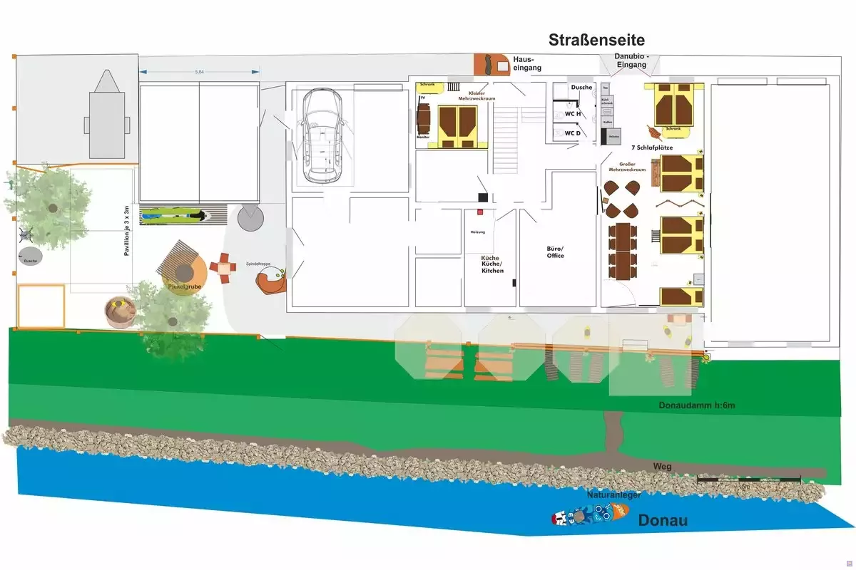 Im Erdgeschoss befindet sich das Danubio mit dem kleinen und großen Raum, sowie die Küche, das Büro, Lager und Treppenhaus.