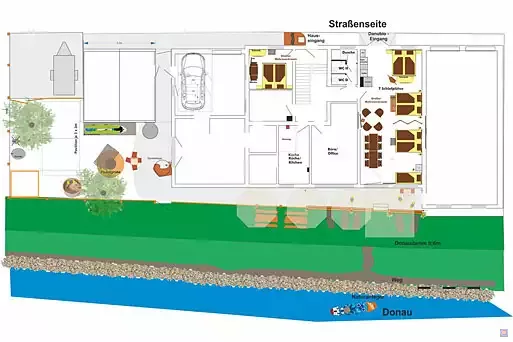 - (4) Im Dachgeschoß (4-6 Personen) die Ferienwohnung „Danubes“ mit Bad/ Dusche/ WC und Küche