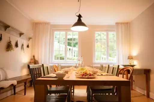 Im unteren Stockwerk findet sich eine großzügige Küche und zwei Esszimmer für gemeinsames Speisen und Beisammensitzen.