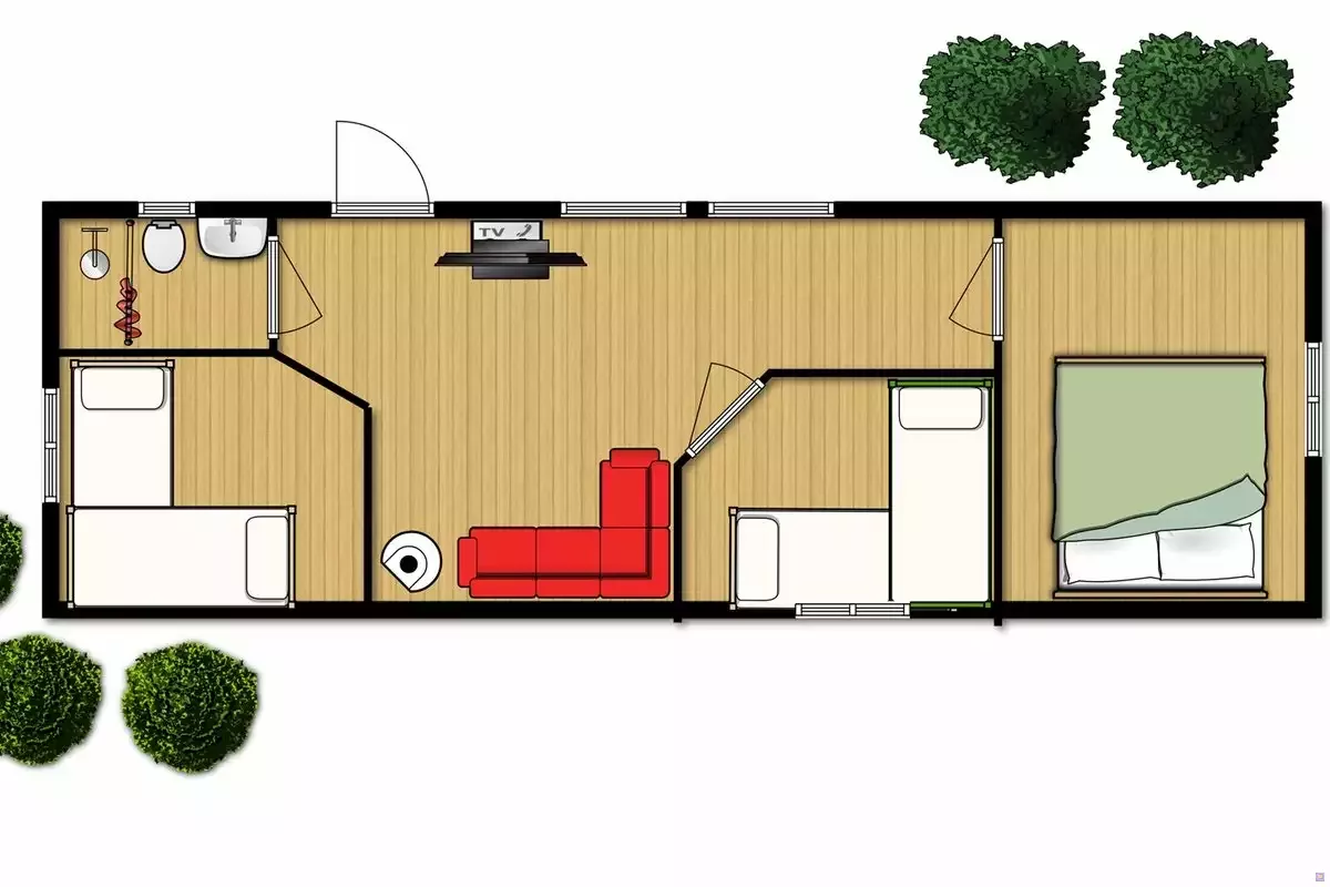 Die vier Schlafhäuser sind robuste Unterkünfte und jedes hat drei Schlafzimmer. Ein Schlafzimmer ist mit Doppelbett ausgestattet während die beiden anderen Zimmer über 2 Einzelbetten verfügen. Darüber hinaus ist der Häuschen mit einem Bad mit Dusche und WC ausgestattet. Wenn Sie mit einer Gruppe von bis zu 18 Personen übernachten, bekommen sie drei dieser schönen Häuschen zur Verfügung gestellt