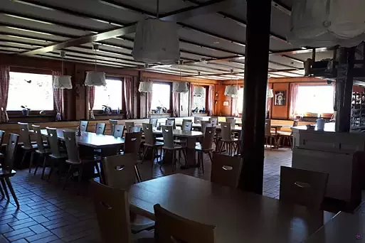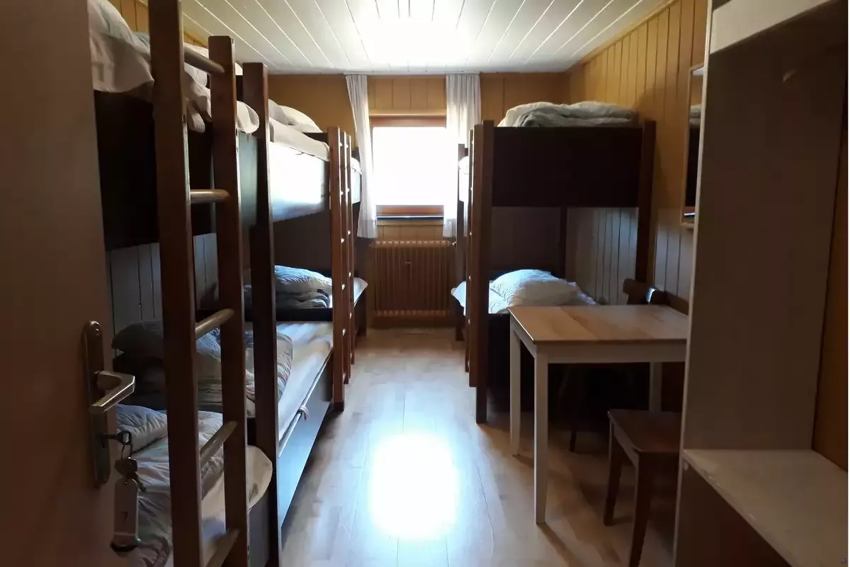 Unsere im Stil einer Hütte eingerichteten Zimmer mit Etagenbetten können bis zu 70 Personen aufnehmen. Wir sind aber kein Selbstversorger-Haus!