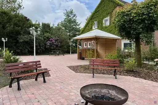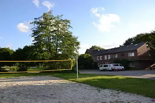 Das weitläufiges Außengelände, mit Garten, Grill, Beachvolleyballfeld, großer Terrasse mit Sitzmöglichkeiten, Innenhof mit Bierzeltgarnituren umsäumt von drei großen Eichen sowie ausreichend Parkplätze, reicht bis an den Fehnkanal heran. Im Gästehaus befindet sich ein Kicker, Tischtennis, Billard, Darts, WLAN, DVD, TV, Musikanlage.