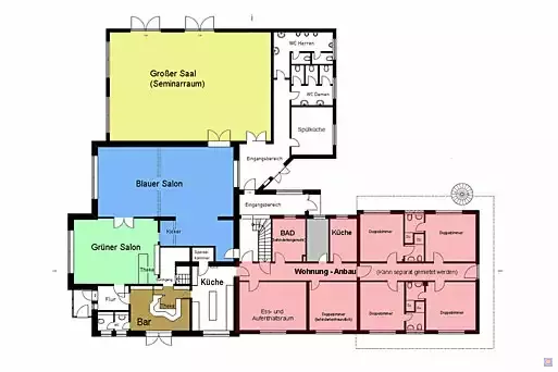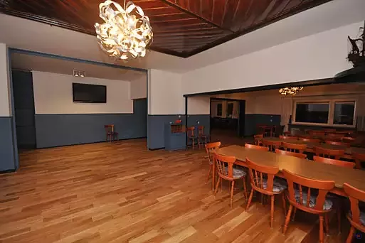 - Der Blaue-Salon bietet hier Platz für bis zu 50 Personen. Mit seinem Eichenboden strahlt er Ruhe und Behaglichkeit aus und eignet sich zum Speisen und Feiern, auch ein Billardtisch und ein Turnierkicker stehen hier.
