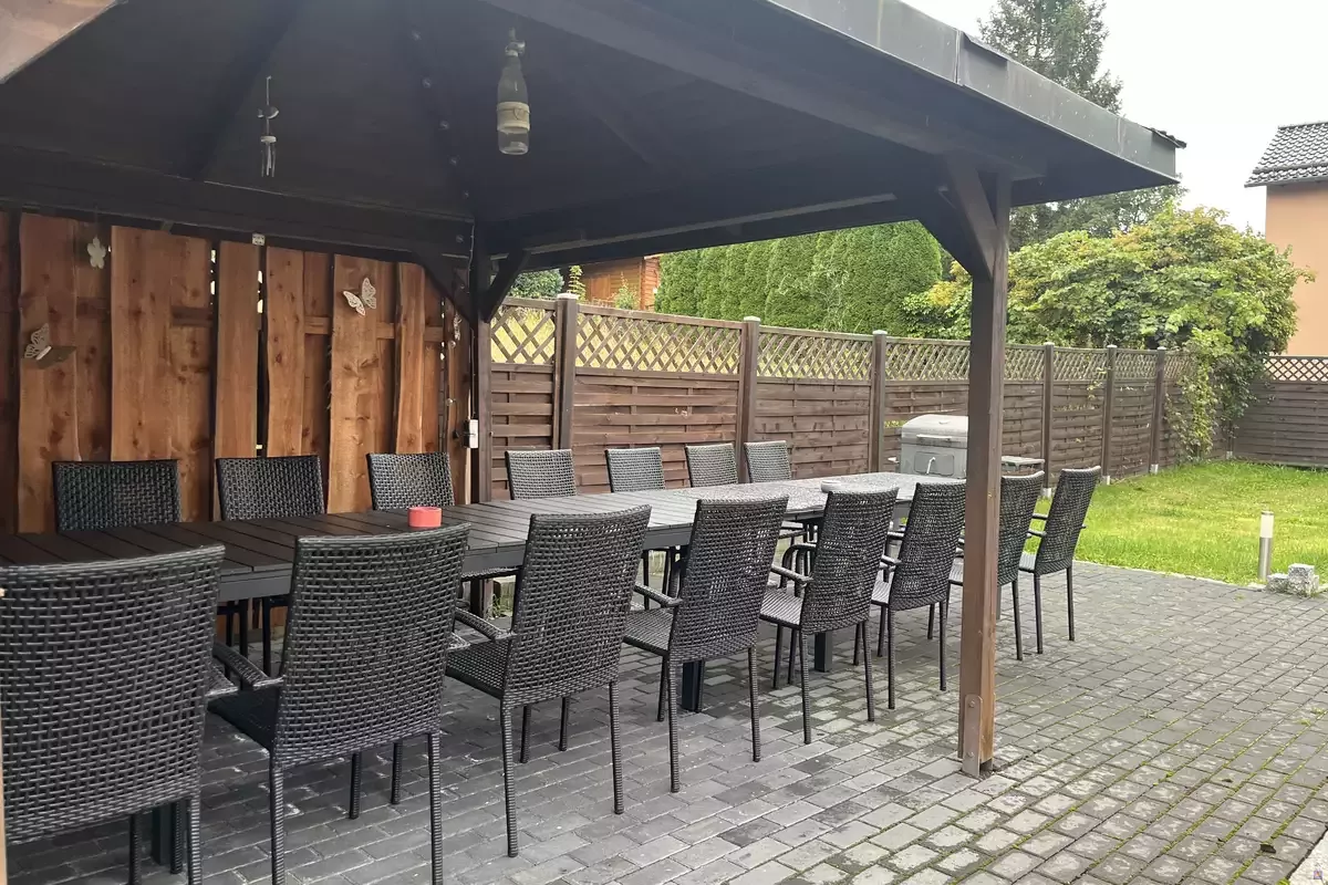 Der gemütliche Essbereich mit Kamin schafft eine warme, einladende Atmosphäre – perfekt für gemeinsame Abende nach einem aktiven Tag in der Natur. Die vollständig eingezäunte Gartenanlage mit Terrasse, Sommermöbeln und Holzkohlegrill lädt bei gutem Wetter zum Verweilen im Freien ein. Mehrere Balkone bieten zusätzliche private Rückzugsorte mit Ausblick.