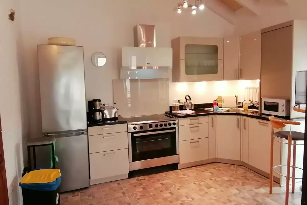 Die große Wohnküche ist das Highlight des Ferienhauses. Der 35m² große Gemeinschaftsaum ist mit einer creme-weißen Küchenzeile mit Granitarbeitsplatte eingerichtet sowie einem besonders großen Herd mit 5-fach Cerankochfeld. Ein Geschirrspüler, Kühlschrank, Mikrowelle, Kaffeemaschine, Toaster und Wasserkocher runden die schöne Küche ab. Natürlich sind auch ausreichend Geschirr, Töpfe, Pfannen, Besteck und Gläser vorhanden .