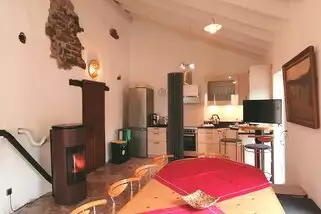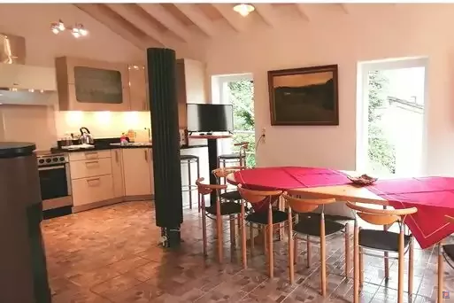 Das Ferienhaus Enztal hat einen großen kombinierten Gruppenraum mit Wohn-, Ess-, und Küchenbereich. Die große Wohnküche ist für den gemeinsamen Aufenthalt aller Gäste ausgelegt.