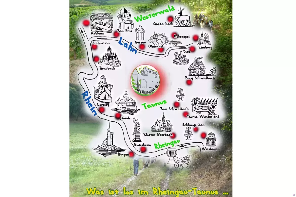 Interessante Ausflugziele, wie das Weltkulturerbe Limes mit Rönerkastell-Holzhausen, der romantische Mittelrhein mit seinen unzähligen Burgen, Rüdesheim a. Rhein mit dem Niederwalddenkmal und Drosselgasse und die Badeorte an unserer Bäderstrasse (B260); Bad Ems, Bad Schwalbach, Schlangenbad und Wiesbaden warten auf Ihren Besuch. Viele markierte Wanderwege, zum Wispertal, der Limeswanderweg und Rheinsteig wollen von Ihnen zu Fuß erobert werden.