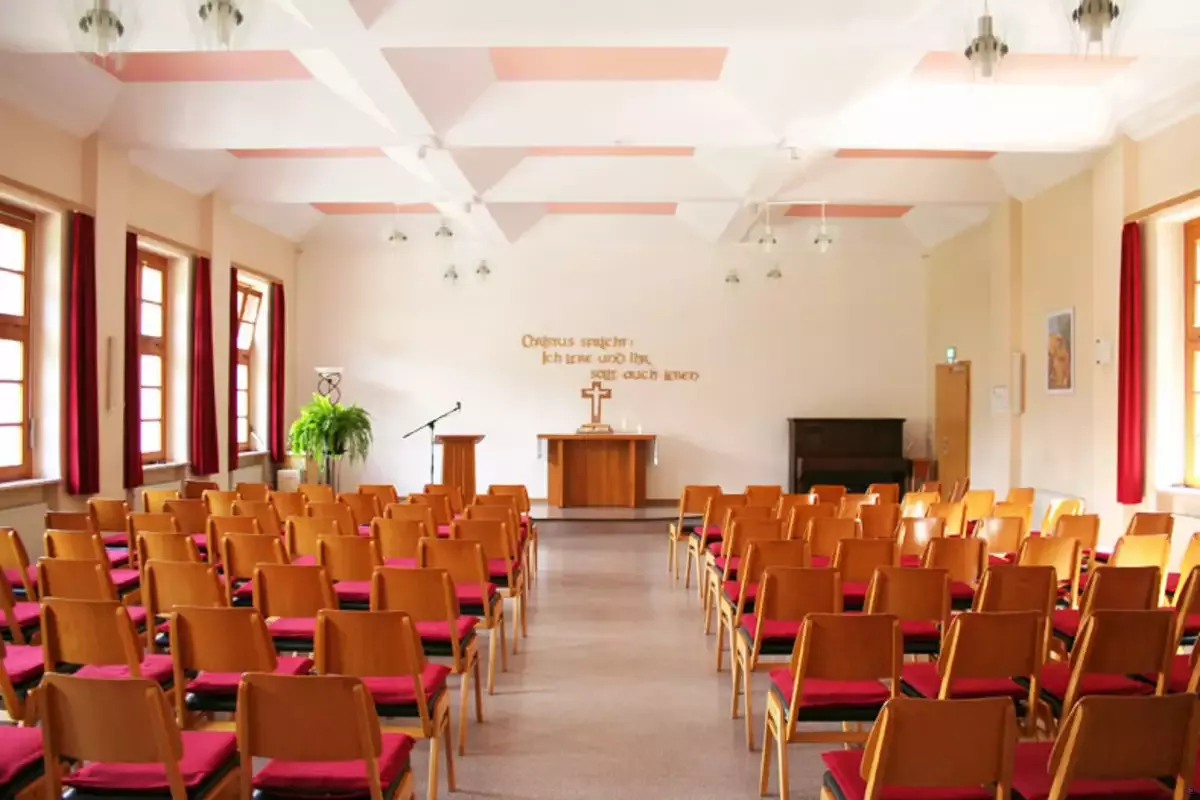 Andachtssaal mit fest installiertem Beamer und Tonanlage, 2 Mikrofone und Mehrspur-Mischpult
