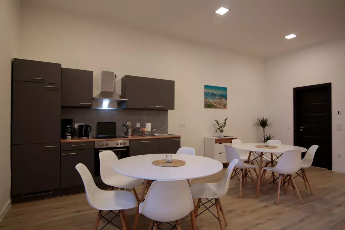 Jedes Hostel verfügt über Gemeinschaftsbereiche mit moderner, voll ausgestatteter Küche sowie großzügigen Ess- und Aufenthaltsräumen – ideal für gemeinsame Mahlzeiten, Teambesprechungen oder entspannte Abende. Die Sanitärbereiche sind modern gestaltet, geräumig und gepflegt.
