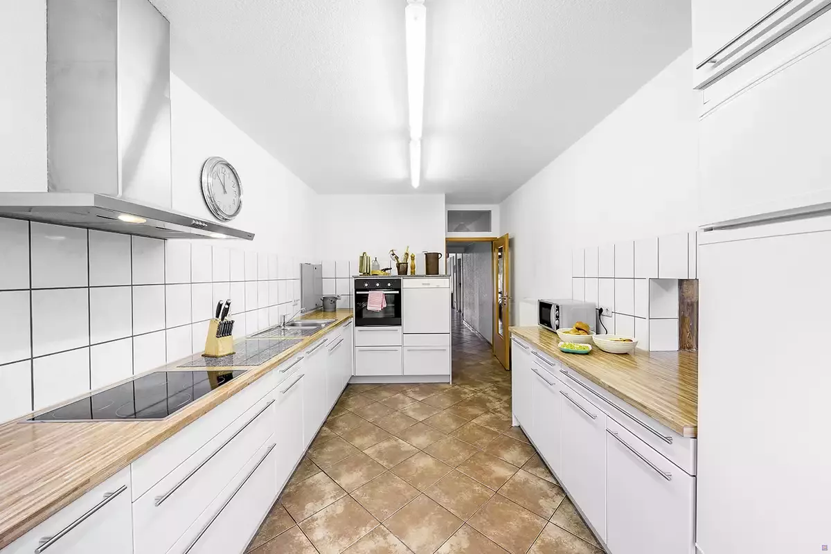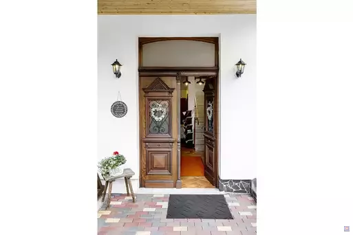 Im Erdgeschoss befinden sich ein großzügiger Eingangsbereich mit Garderobe, eine sehr gut ausgestattete Küche, Toiletten, Bad mit Waschmaschine und ein großer Aufenthaltsraum mit Durchreiche zur Küche.