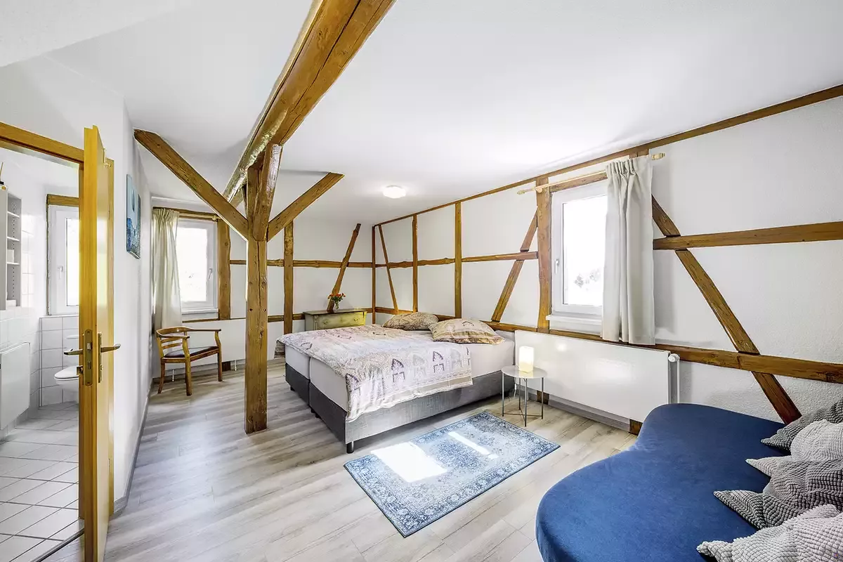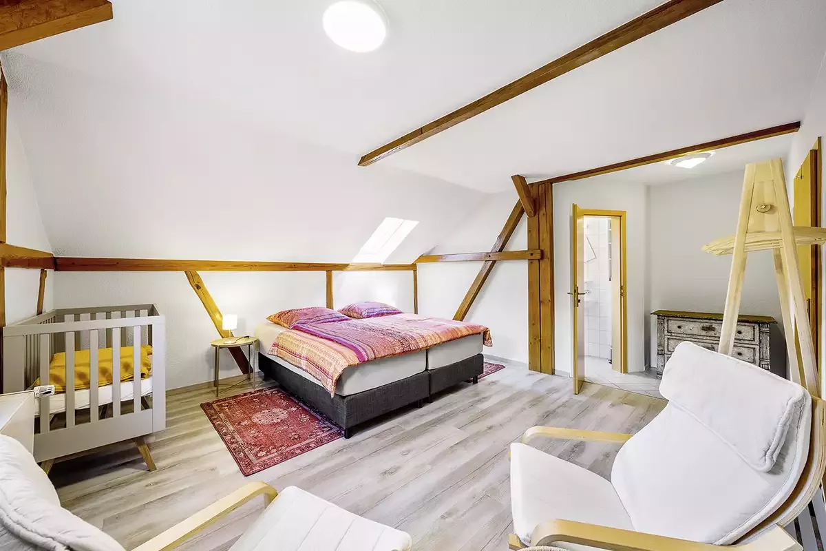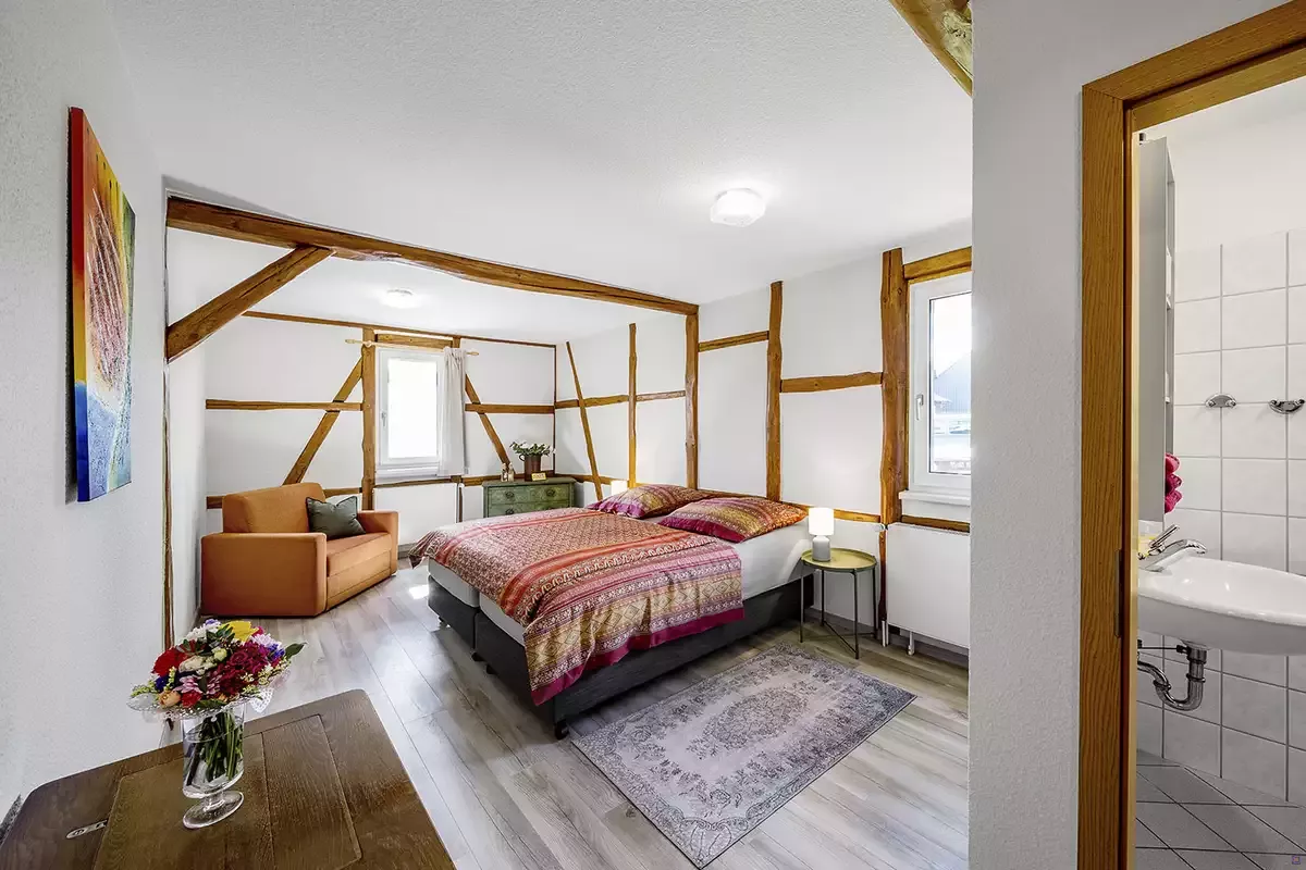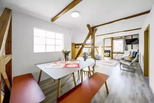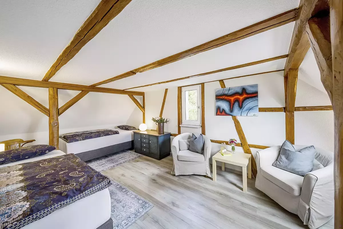 Ursprünglich als Scheune 1906 im Fachwerkstil erbaut, wurde unser Gästehaus 1998 als Ferienhaus mit sechs Schlafräumen und zwei Aufenthaltsräumen umgebaut und 2022 renoviert und neu eingerichtet.
