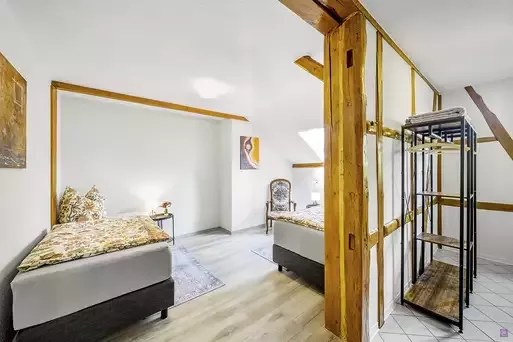 Zwei weitere Schlafräume mit je zwei Betten befinden sich im dritten Stock. Diese Zimmer teilen sich ein Bad mit Badewanne.