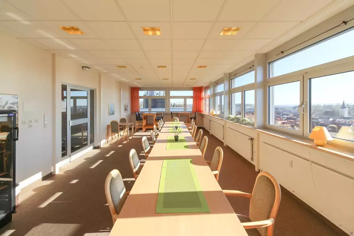Das Panoramazimmer mit Küche bietet durch ein dreiseitiges Fensterband einen traumhaften Blick über Bad Sachsa. Ideal für Tagungen, Seminare und Gruppentreffen. Hell, freundlich und großzügig.