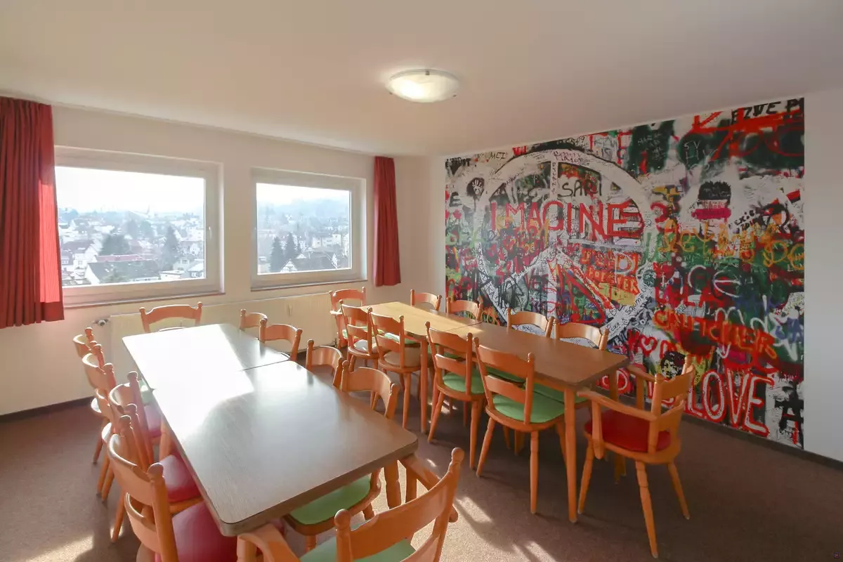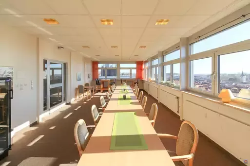 In der 5. Etage liegt der Gruppenraum Ravensberg mit Küche für ca. 20 Personen – ideal für kleine Familiengruppen. In der 6. Etage befindet sich das Panoramazimmer mit Küche und dreiseitigem Fensterband mit Blick über Bad Sachsa, perfekt für Tagungen, Workshops oder Gruppentreffen.