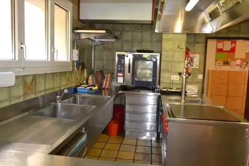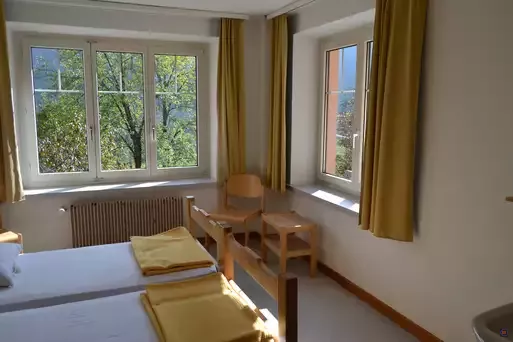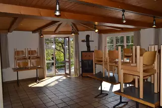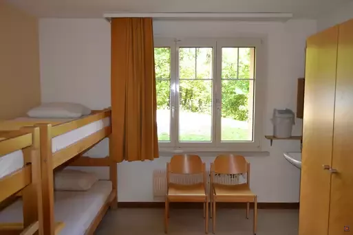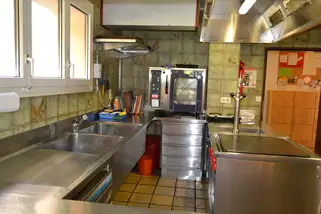 EG: Speise- und Aufenthaltsraum mit Kamin und Klavier, ein weiterer kleinerer Aufenthaltsraum als Lesezimmer, Leiterbüro mit Schreibtisch und Internetanschluss (Wlan), Küche mit Vorratsraum, ein 2-Bett-Zimmer mit fl. Wasser, zwei 4-Bett-Zimmer mit fl. Wasser, 3 separate WC.