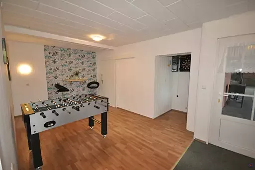 Darüber hinaus gibt es eine gutausgestattete Küche, einen Gruppen- / Speiseraum mit großem 50 Zoll-TV, ein Teamerzimmer (Wohnzimmer), einen Freizeitraum mit Turnierkicker und E-Dart sowie eine Terrasse und Garten mit Sitzgelegenheiten, Beachvolleyballfeld, Grillstelle und ausreichend Parkplätze. Außerdem ist im ganzen Haus freies W-Lan verfügbar.