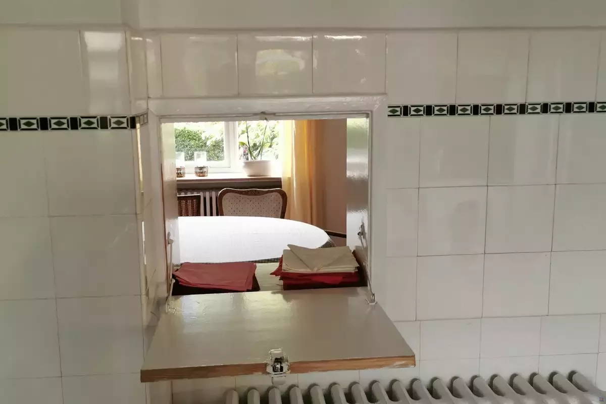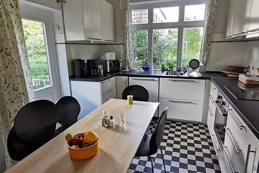 In der weißen modernen, gut ausgestatteten Küche, in der auch Elemente der Dreißiger Jahre erkennbar sind (Durchreiche, Fliesenbordüre und Bodenfliesen....), finden an einem Esstisch 10 Personen Platz.