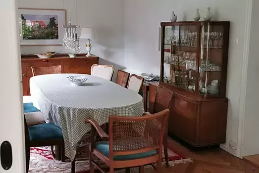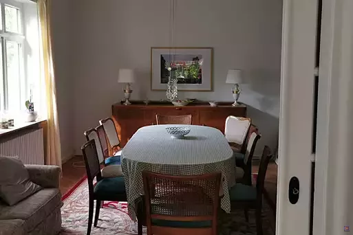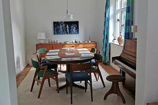 Der dreiteilige Wohnbereich im EG 65 qm, Raumhöhe ca. 300 cm, besteht aus dem Esszimmer (Essplatz für 10 Personen), das durch eine doppelte Schiebetür abtrennbar ist. Dort befindet sich auch ein Doppelschlafsofa , so dass in 5 Räumen Schlafgelegenheiten verfügbar sind.