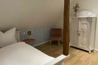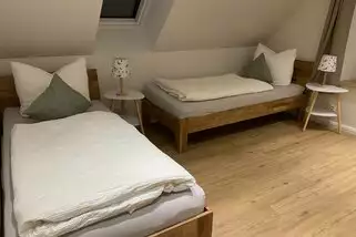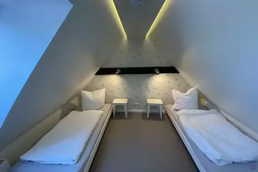 Wer aber den Sternen noch näher sein möchte, kann das Zimmer mit zwei Einzelbetten im ausgebauten Dachgeschoss beziehen. In dem anschließenden zweiten Wohnzimmer haben wir durch die alten Balken den Charme des Bauernhauses erhalten. Hier kann man auch mal ganz „für sich sein“ und einfach die Seele baumeln lassen.