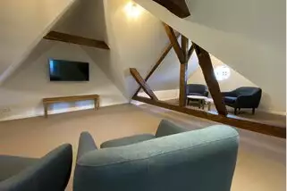 Das Wohnzimmer im EG und das Esszimmer eignen sich gut gesellige oder kreative Zusammenkünfte. Auch die großzügige Terrasse und der Garten sind Rückzugsorte zum Arbeiten und zum Genießen. Ebenso das Wohnzimmer im Dachgeschoss.
