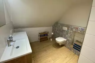 In der oberen Etage befinden sich zwei Doppelzimmer und drei Zimmer mit jeweils zwei Einzelbetten. (der 17. und 1. Schlafplatz ist durch eine Leiter mit einem der Schlafzimmer verbunden) Zwei Bäder mit Dusche, hell und freundlich, macht diese Etage vollständig.