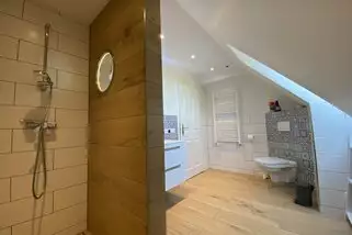 Die Unterkunft ist teilweise behindertengerecht: Das Erdgeschoss ist barrierefrei und auch der Übergang zur Terrasse. Ebenso befinden sich im unteren Bereich zwei Schlafzimmer und in behindertenfreundliches Badezimmer mit Dusch und Badewanne.
