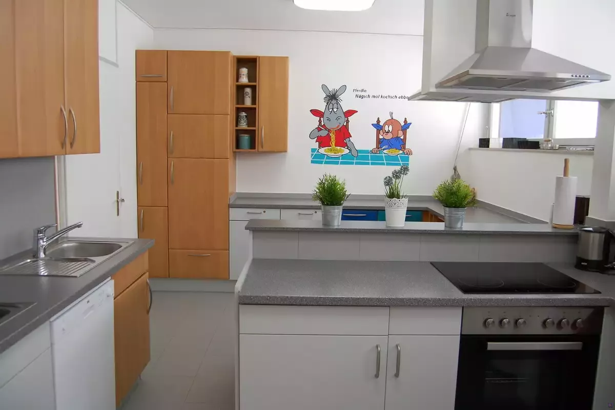 Mittels einer Faltwand können die Räume zu einem 100 qm großen Saal umgewandelt werden. Im UG befindet sich ein Tischtennisraum. Großer heller Essbereich mit Sicht auf den Segelflugplatz. Neue Einbauküche mit 2 Herde, 2 Spülmaschinen, 2 Kühlschränke, Geschirr, Besteck, Töpfe usw.