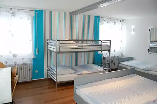 10 DZ und ein 5er Zimmer (25 Betten). Die Schlafräume befinden sich im OG.