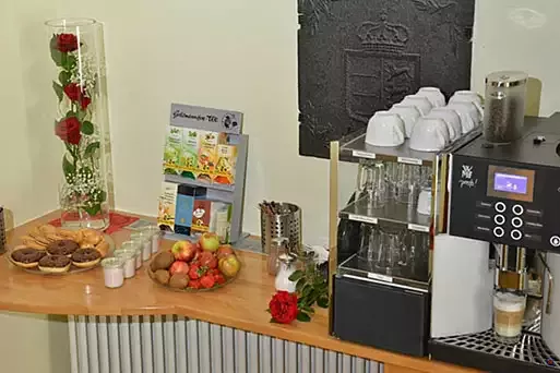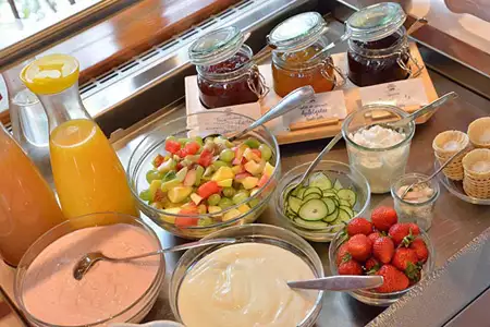Bei der gesunden, ausgewogenen und abwechslungsreichen Küche kommt jeder auf seinen Geschmack. Beim Frühstück, Mittag und Abendessen stehen reichhaltige und attraktive Buffets zur Auswahl. Das Frühstücksbüfett enthält neben frischen Brötchen/Brot, Wurst-/Käseplatten, Marmeladen, Eierspeisen, Müslis und Obst. Kaffee, Tee, Milch und Saft runden den morgendlichen Start ab. Mittags bieten wir verschiedene Vorspeisen, Salate, Suppe, drei verschiedene Hauptgerichte, davon eines vegetarisch und Desserts an.