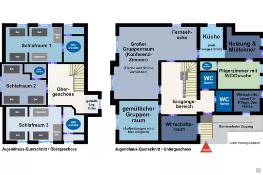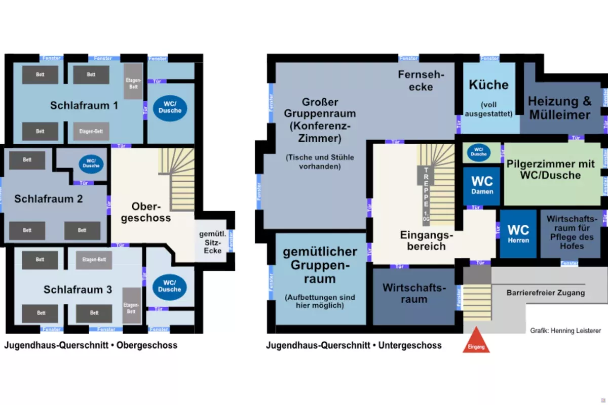 Im OG befinden sich drei Gästezimmer. Links und rechts stehen pro Zimmer sieben Betten zur Verfügung (davon zwei Doppelstock- und drei Einzelbetten). Das Mittelzimmer besteht aus drei Einzelbetten. In jedem Zimmer gibt es ein WC mit Dusche. Im kleinen Gruppenraum im EG sind Aufbettungen (z.B. für Betreuer) möglich.