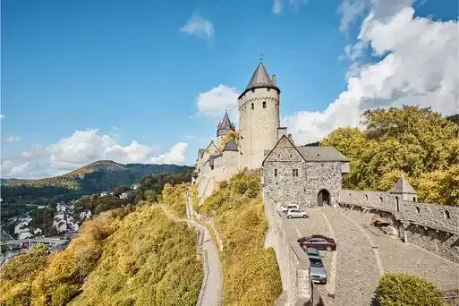 Ein kostenloser öffentlicher PKW-Parkplatz steht direkt an der Burg zur Verfügung. Weiterhin steht der kostenlose Parkplatz " Langer Kamp" für PKW und für Fahrzeuge ab 3,5 Tonnen am Fuße der Fritz-Thomée-Straße zur Verfügung. Der Fußweg von dort zur Burg beträgt zehn bis 15 Minuten. Die Straße zur Burg ist für Fahrzeuge ab 3,5 Tonnen gesperrt.