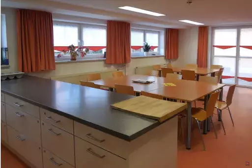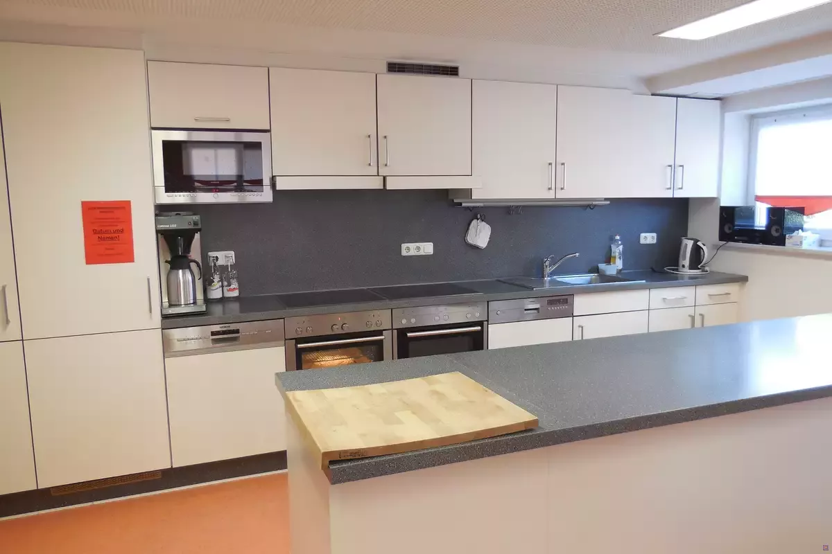 Die große und gut ausgestattete Küche eignet sich sehr gut zum gemeinsamen Kochen, und zwar auch für große Gruppen. Der Speisesaal ist nur durch die Küchentheke vom Kochbereich getrennt. Direkt neben dem Speisesaal ist ein Aufenthaltsraum.