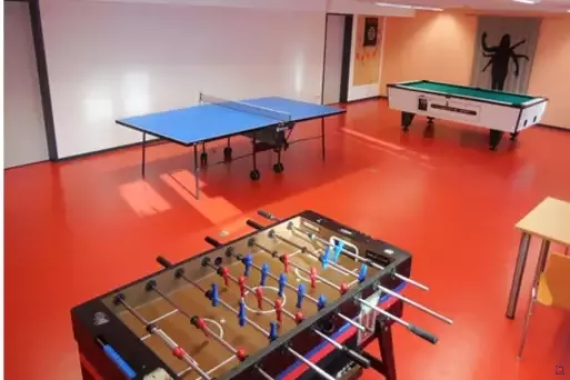 Wir haben außerdem noch eine große Spielesammlung, einen Kicker, einen Billardtisch und Dart. Manchmal schalten Gäste auch unseren Fernseher ein.