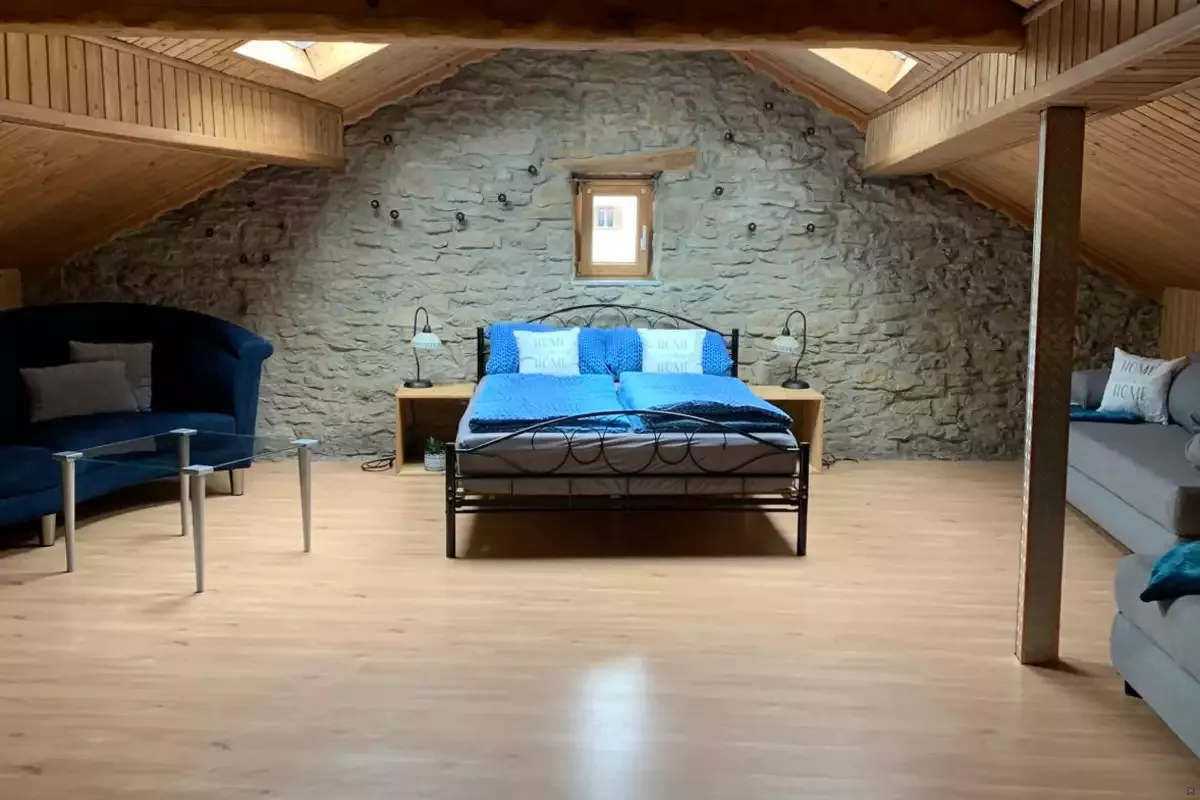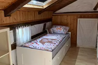 Insgesamt stehen zwei Bäder, ein Wohn- und Arbeitszimmer sowie ein großes Familienzimmer im Dachgeschoss zur Verfügung. Die Schlafmöglichkeiten umfassen ein Bett (140 × 200 cm), zwei Betten (je 90 × 200 cm) sowie vier Schlafcouches (je 140 × 200 cm). Für Kinder ist das Haus bestens geeignet, ein Kinderklappbett ist vorhanden.