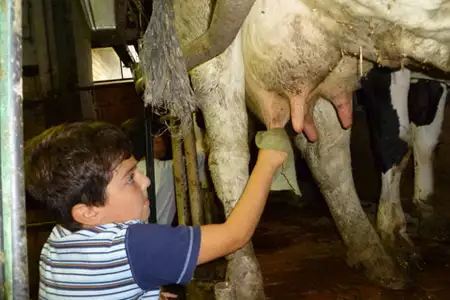 Beim Melken dürfen alle mitmachen. Euter waschen, mit der Hand melken und das Melkzeug ansetzen. Hofarbeit wie Kälbern Milch geben, Ställe ausmisten, Tiere streicheln kommt nicht zu kurz. Mal muss ein Wasserfass bei den Weidetieren gewechselt oder ein neuer Weidezaun gesteckt werden. Auch hier dürfen die Kinder dabeisein.