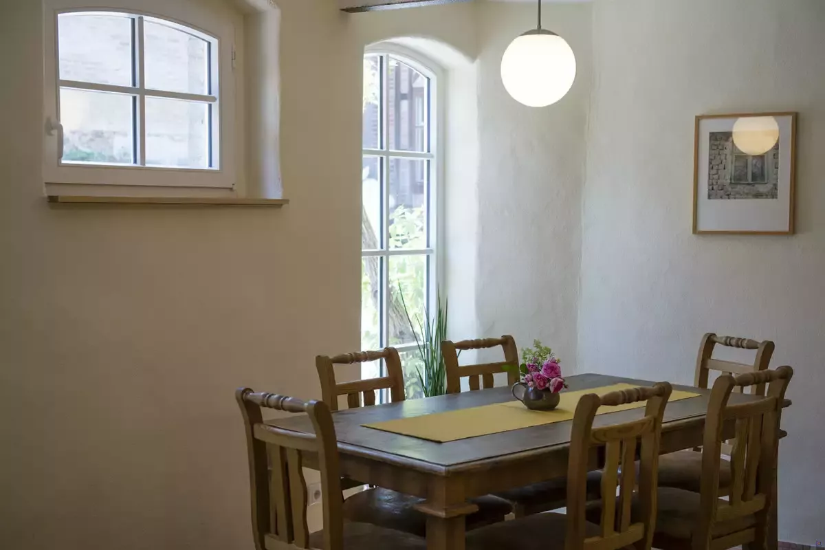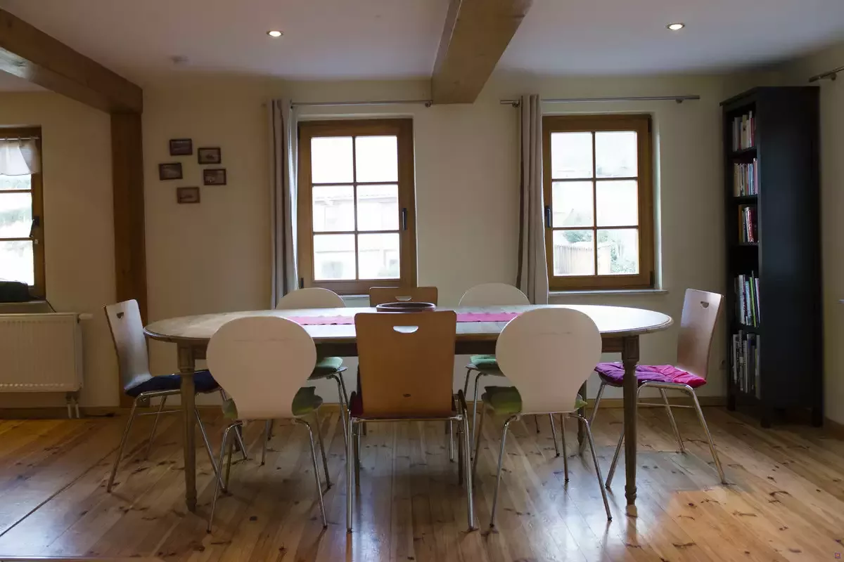 Im Gästehaus ist eine Wohnküche mit einem Tisch für max. 12 Personen. In der Ferienwohnung haben max. 6 Personen Platz am Tisch.