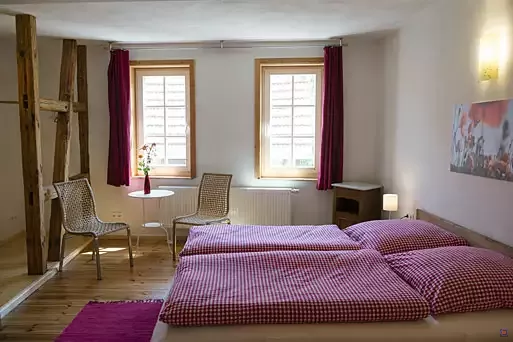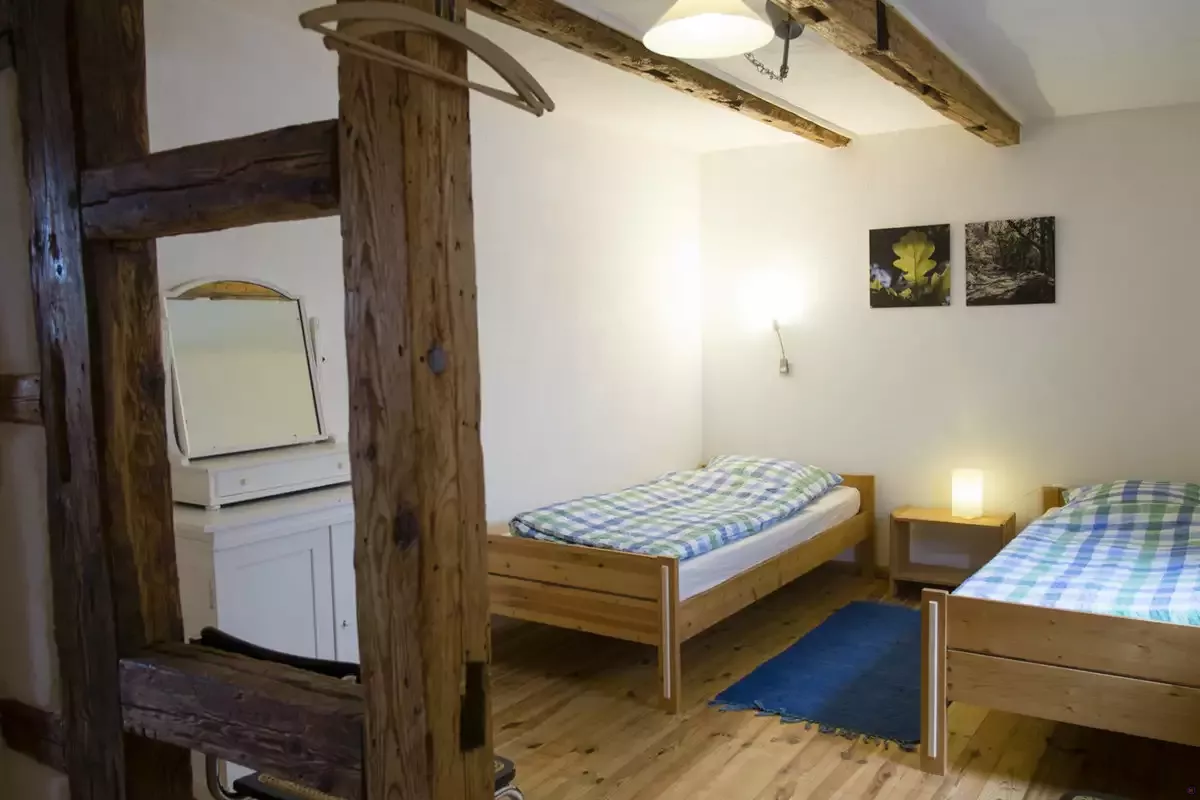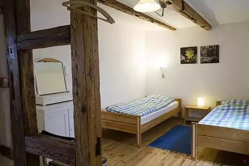 Auf dem KulturNaturHof haben wir ein Gästehaus mit insgesamt 11 Betten in 4 Doppelzimmern und einem Dreibettzimmer sowie eine Ferienwohnung mit 6 Betten in drei Doppelzimmern.
