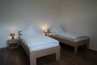 Gasthaus 2 bietet im 1. Obergeschoss Platz für 22 Gäste. Die Zimmer verteilen sich auf zwei Doppelzimmer, sieben Zweibettzimmer und vier Einzelzimmer. Eine Aufstockung auf bis zu 24 Personen ist ebenfalls möglich und macht dieses Gasthaus besonders attraktiv für Gruppen. Jedes Zimmer hat ein einzelnes Badezimmer.