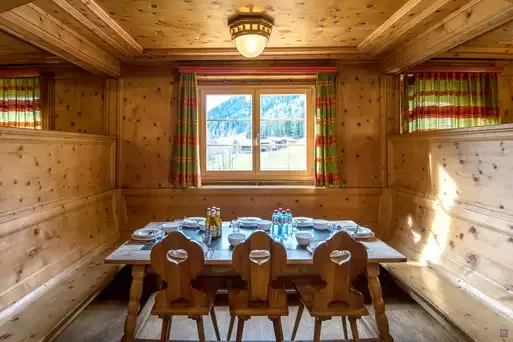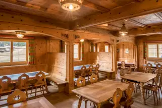 Auch der urige holzvertäfelte Speisesaal im Erdgeschoss bietet genügend Platz für 90 Personen in gemütlicher Atmosphäre. Das Haus ist nicht barrierefrei/behindertengerecht eingerichtet.
