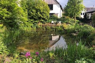 Für Seminare: großer Bauerngarten mit Obstwiese, Teich und diversen Sitzplätzen.