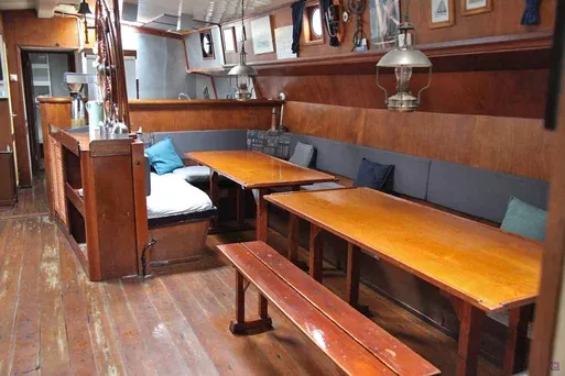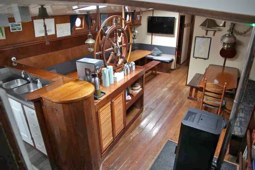 Unterdecks ist kuscheln im warm gestalteten Tagesraum mit offener Küche und Bar mit Zapfhahn sehr gut möglich!... Hier kann man einige gesellige Stunden beim Kochen, Spielen, Reden... verbringen! Übernachtet wird in einer der acht gemütlichen Kajüten, in denen überall warme Heizungen vorhanden sind.