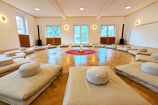 Herzstück des Hauses ist ein großzügiger Seminarraum mit rund 90 Quadratmetern, ergänzt durch einen weiteren Gruppenraum mit etwa 40 Quadratmetern. Beide Räume sind hell, freundlich und vielseitig nutzbar, geeignet für Gruppenprozesse, Aufstellungsarbeit, Meditation, Bewegung oder intensive Trainingssequenzen. Die Raumstruktur ermöglicht sowohl Arbeiten im Plenum als auch parallele Kleingruppenformate.